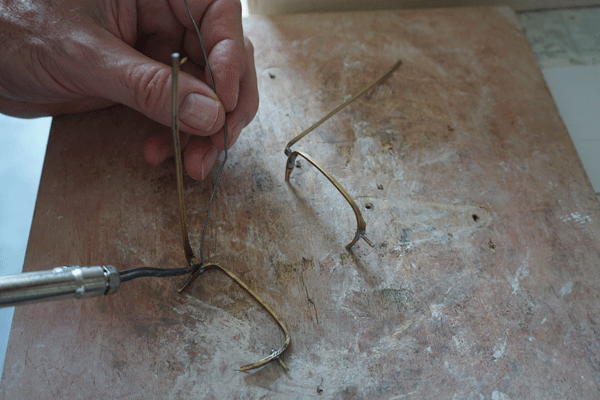 Une pointe en laiton maintient le cercle dans un trou sur le nez et les branches sont collées dans un trou sous les cheveux.